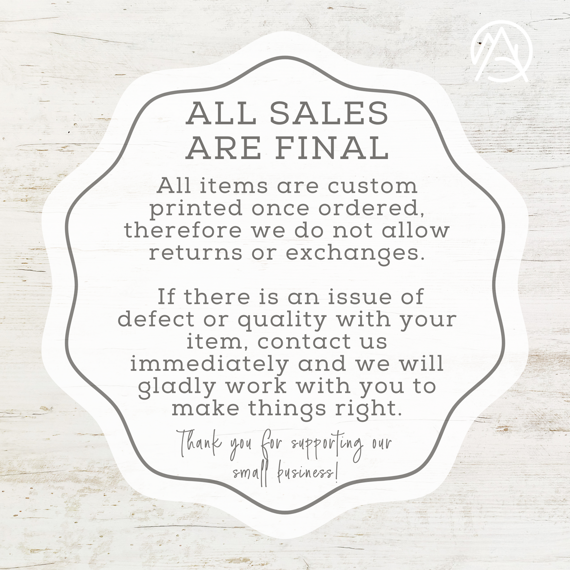RETURNS OR EXCHANGES: All items are custom printed as ordered, therefore we do not accept returns or exchanges for incorrect size(s). Please refer to the size chart in the pictures to determine the best size to order. If there is an issue of defect or quality with your item, contact us immediately and we will gladly work to make things right!