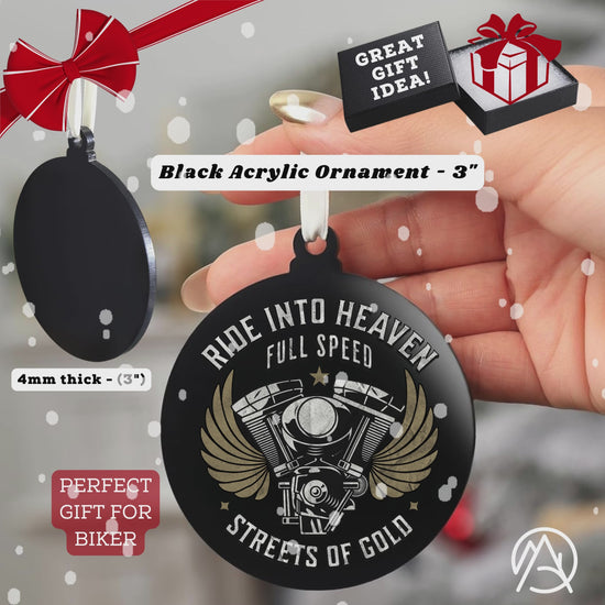 Surprise the motorcycle lover in your life with the perfect gift featuring the phrase Ride Into Heaven Full Speed Streets of Gold. This ornament is perfect for remembering a loved one and is relevant for occasions like Christmas, birthdays, or memorials.